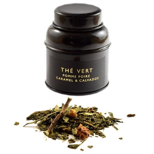 #Caractéristiques#Ingrédients : Thé vert sencha 88%, pomme 5% (pomme, arôme naturel), poire 4% (poire, arômenaturel), Calvados 2%, arôme naturel. Allergènes : Peut contenir des traces de fruits à coques et de lactose. Poids net : 100g. Conservation : À l'abri de la lumière et de l'humidité. Suggestion de dégustation : Infusion 2 à 3 mn dans une eau à 80°C.
